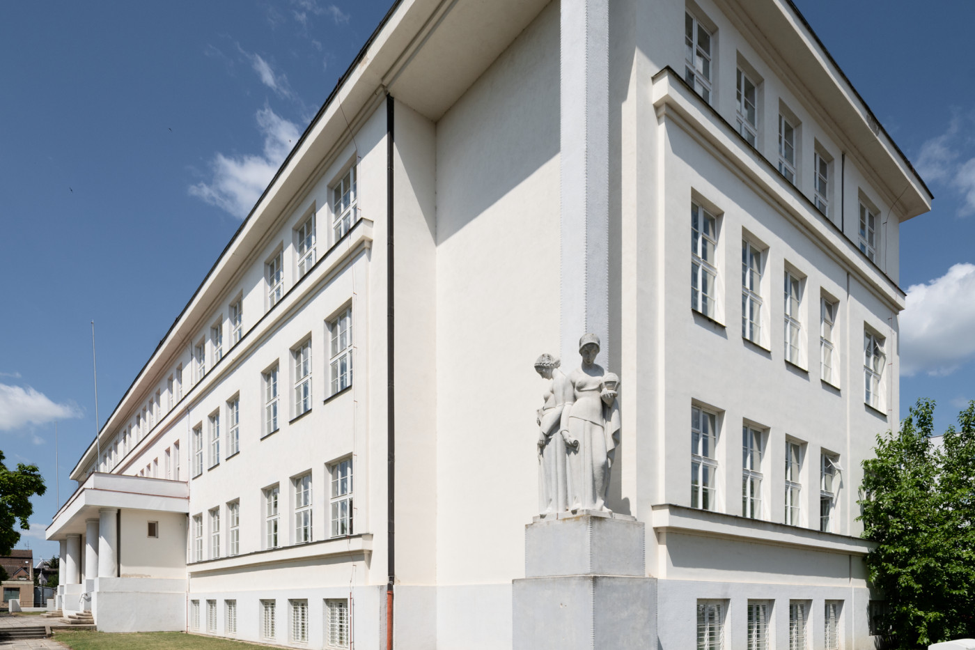 Z jeho meziválečné tvorby pak oceňuji především školu v Hodoníně. Je to velká budova, která si v okolí trůní jako nějaký zámek v zahradě. Většina té dlouhé fasády je vlastně bez jakýchkoliv ozdob, jen vstupní partii lemují dvojice sloupů. Nejzajímavější jsou ta ustoupená jakoby vykouslá nároží se subtilními pilíři, které se zvedají k římse. Rámují tu fasádu a zároveň ji vizuálně odlehčují. Můžeš jimi vidět naskrz, takže je to zase taková optická hra a zajímavý pokus o vyřešení tehdy stále aktuálního problému, jak pojímat rozlehlé ploché fasády, tak aby nepůsobily příliš monotónně a nudně. Takže ani po padesátce Antonín Blažek nepostrádal inovativní architektonické uvažování. Je ale třeba dodat, že jsem mluvil hlavně o fasádách, ale pokud jde o dispozice tak jsou ty jeho stavby sice kvalitní a dobře a funkčně vymyšlené, ale zároveň docela tradiční. Pokud jde o prostor tak zkrátka Blažek s žádným extra novým řešením nepřišel.
