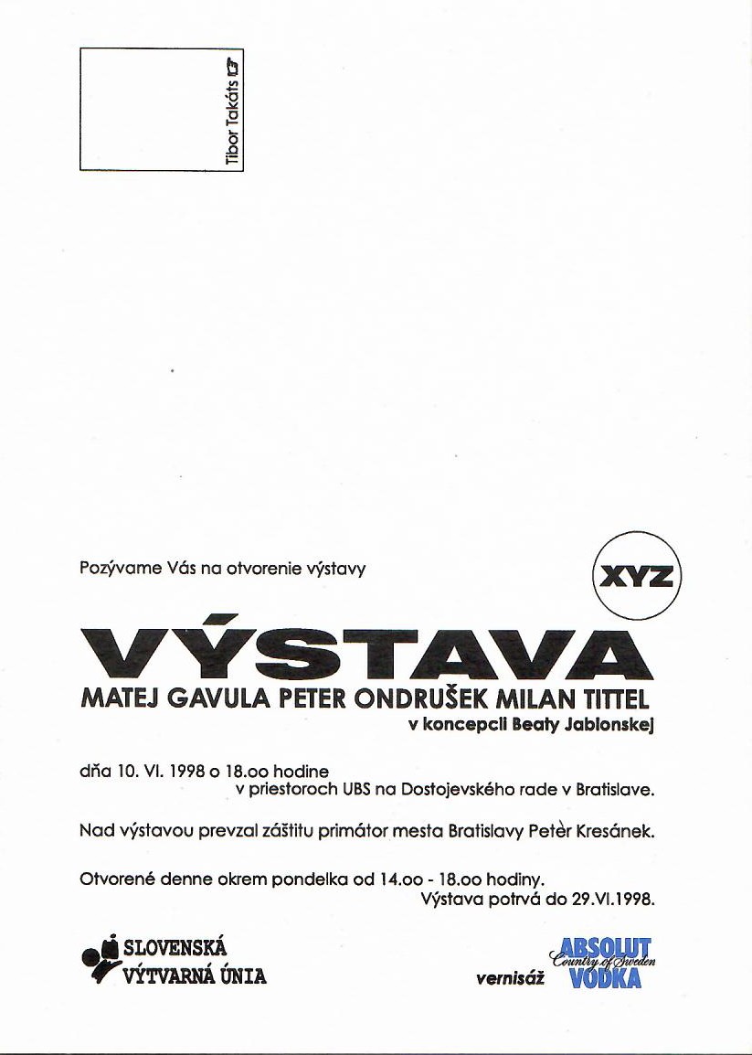 Pozvánka na výstavu, Výstava XYZ. Matej Gavula, Peter Ondrušek, Milan Tittel. Slovenská výtvarná únia, 1998
