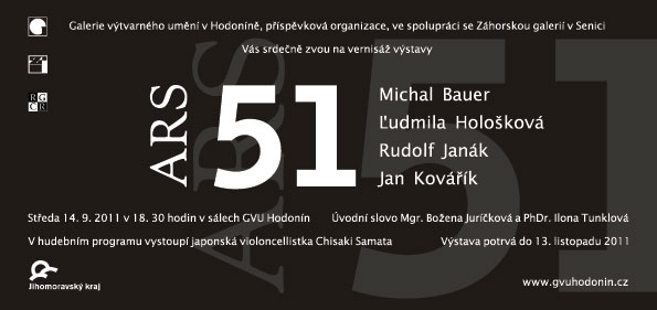 Ve středu 14. září 2011 v 18.30 bude zahájena výstava ARS 51 ve spolupráci se Záhorskou galerií v Senici. Na výstavě se představí dva čeští autoři: Michal Bauer a Jan Kovářík a dva slovenští autoři:Ľudmila Hološková a Rudolf Janák.