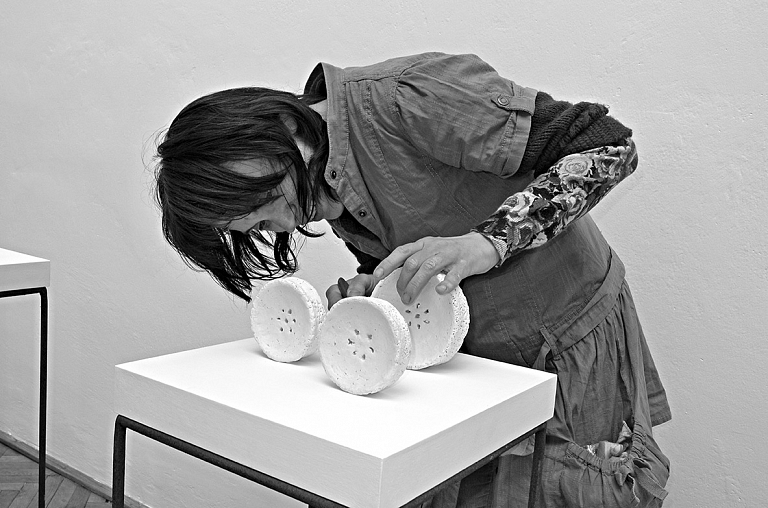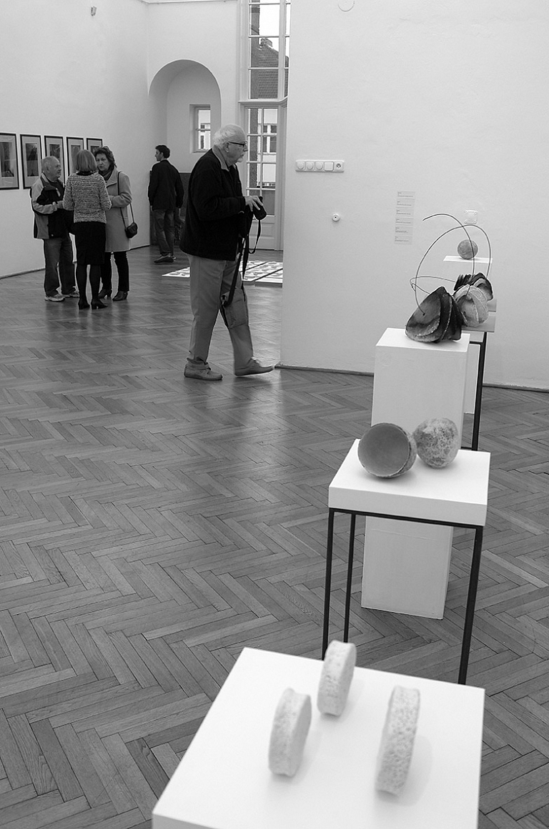 Svou volnou keramickou tvorbu i instalaci představí Jana Krejzová, která žije, tvoří a pořádá keramické workshopy na venkovském statku nedaleko Růžového paloučku poblíž neméně inspirativního historického města Litomyšle. „Má hliněná práce je charakteristická procesem svého vzniku, možnostmi jeho proměny, následným spojováním a instalací takto vzniklých prvků. Je to hra a koncept. Proces je pro mě mnohdy důležitější než výsledek. Používám jednoduché prostředky. Připravuji si receptury hlín, glazur a upřednostňuji výpaly, které mi skýtá technologie Raku.“ Tak charakterizuje svoji tvorbu sama autorka, která je neustálým hledačem. Stále zkoumá, pozoruje, nechce ustrnout, nechává se překvapovat, nezůstává stát na místě. Je otevřená jak novým setkáním se svým oblíbeným materiálem hlínou a svým oblíbeným živlem ohněm, tak také s lidmi. Jedním ze šťastných setkání byla i spolupráce s fotografkou Hanou Rysovou. Ta se dlouhá léta věnovala reportážní fotografii pro různá periodika. Svou volnou tvorbu však zasvětila zachycování přírody, zejména tiché a monumentální kráse kamenů. S jejími fotografiemi se můžeme setkat nejen na výstavách, ale i v knihách Václava Cílka nebo Martina C. Putny.